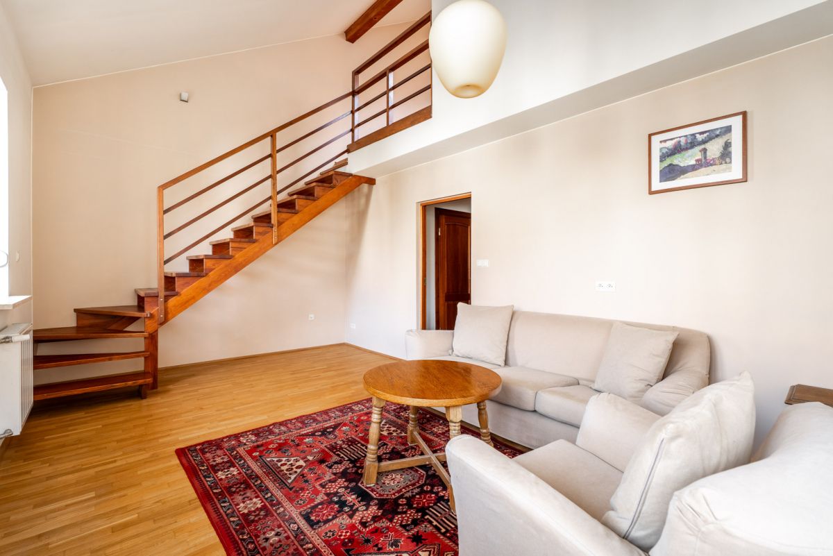 * salon dwupoziomowy 20m2 połączony z sypialnią na poddaszu 13m2,