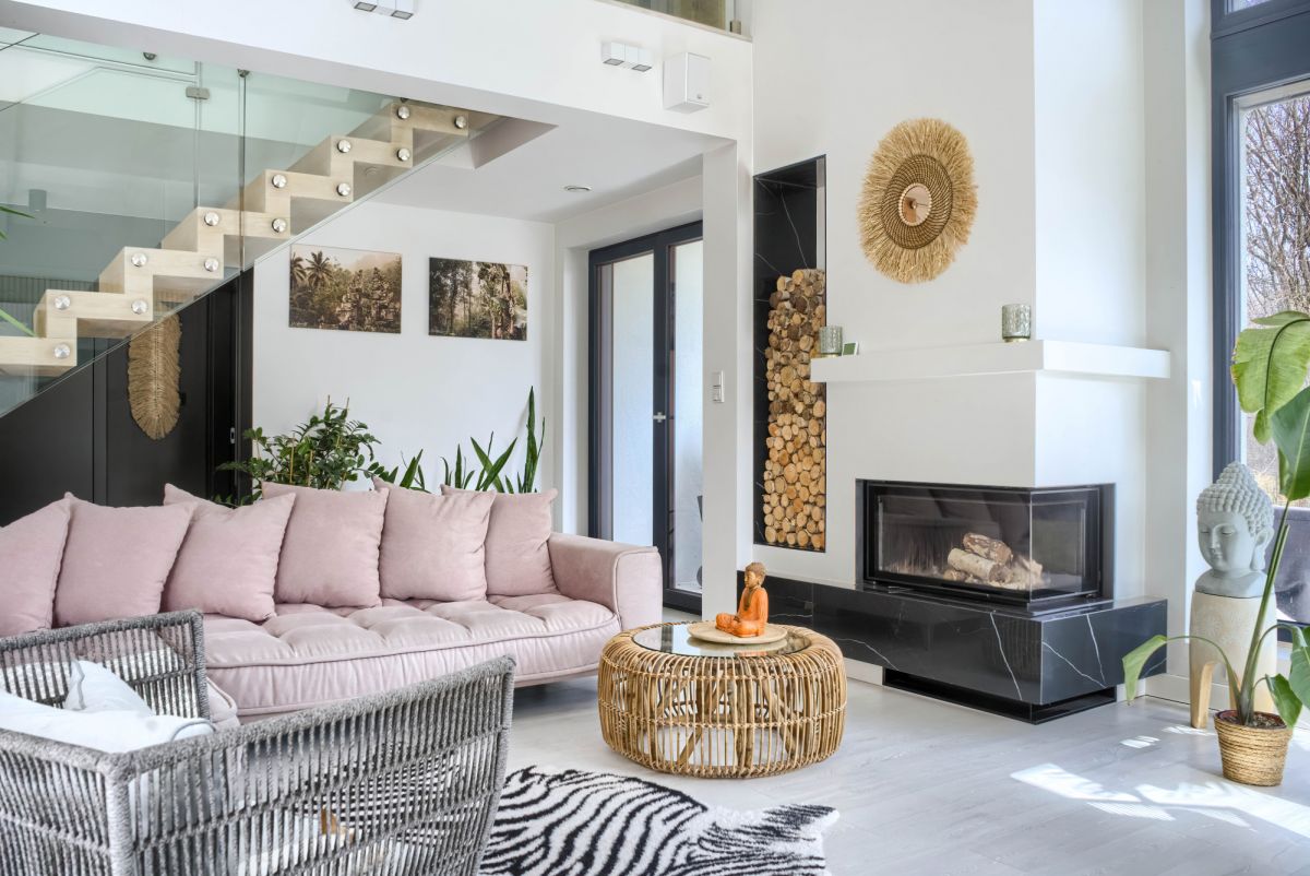 W całym domu zainstalowano ogrzewanie podłogowe, a w salonie znajduje się piękny, duży kominek, który dodaje wnętrzu przytulności i elegancji.