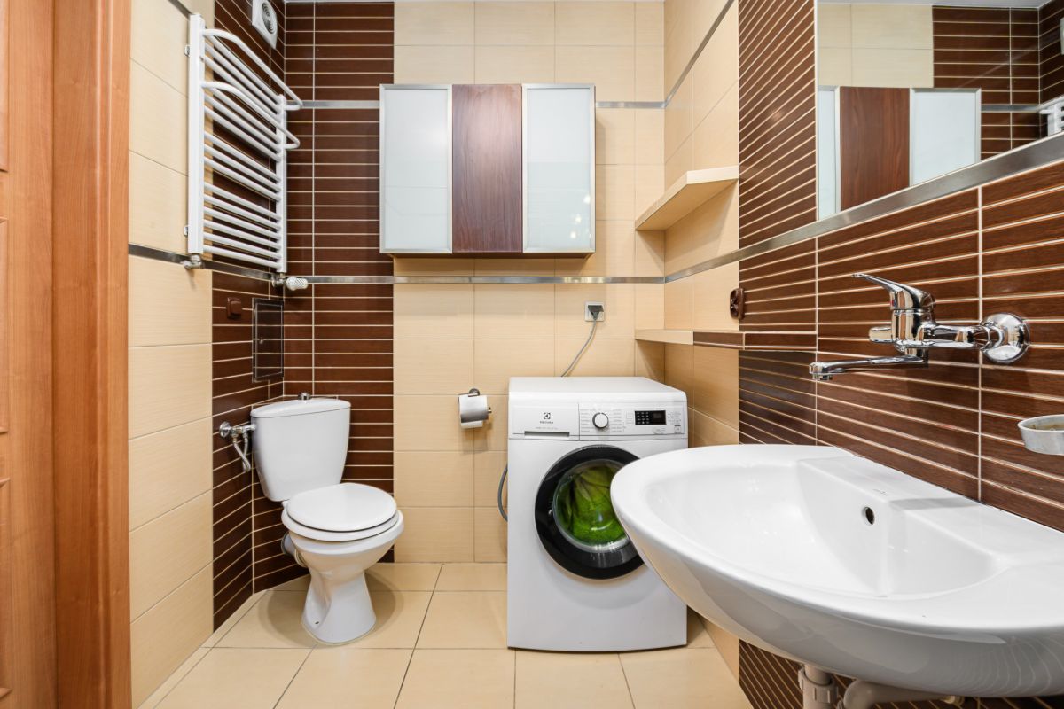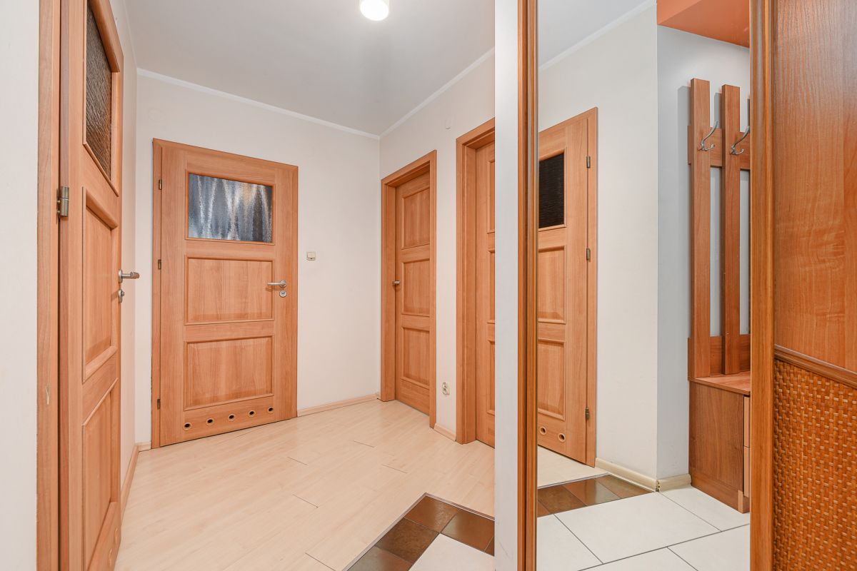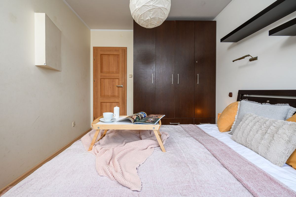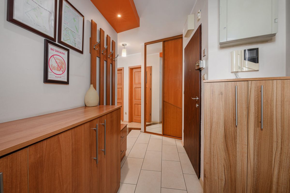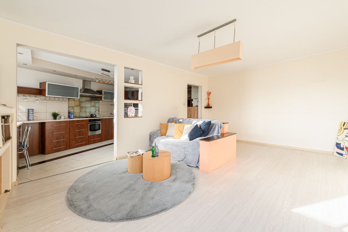 Mieszkanie składa się z przestronnego salonu z wyjściem na balkon oraz lekko odsuniętą w pełni wyposażoną kuchnią. W dalszej części mieszkania sypialnia oraz pokój dziecięcy/ gabinet. Dodatkowo do dyspozycji mamy dużą łazienkę wyposażoną w wannę, WC oraz oddzielna toaleta. Przedpokój z pojemnymi szafami do przechowywania rzeczy.