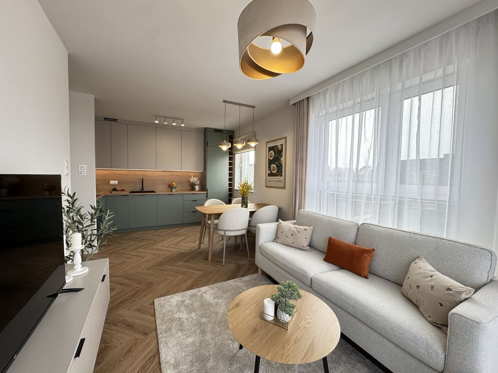 Salon z aneksem kuchennym to serce mieszkania – jasny, harmonijny, otwarty na światło i balkon.