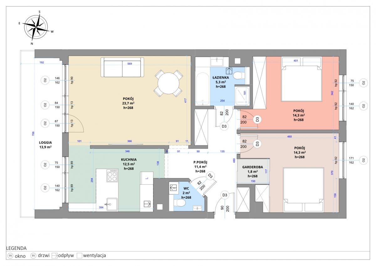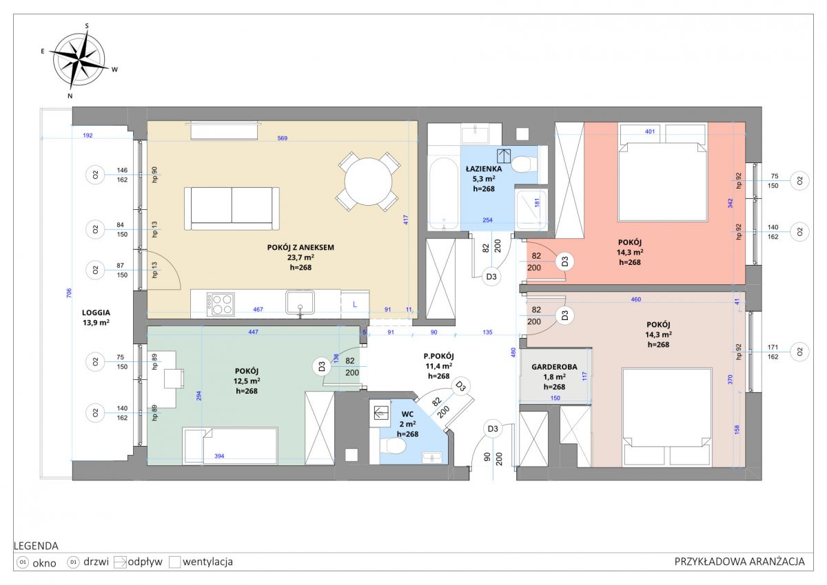 Funkcjonalne rozmieszczenie pomieszczeń umożliwia zmianę obecnego układu na mieszkanie 4-pokojowe oraz zaaranżowanie dwóch kompletnych, w pełni wyposażonych łazienek (propozycja w załączeniu). Do nieruchomości przylega duży balkon.
