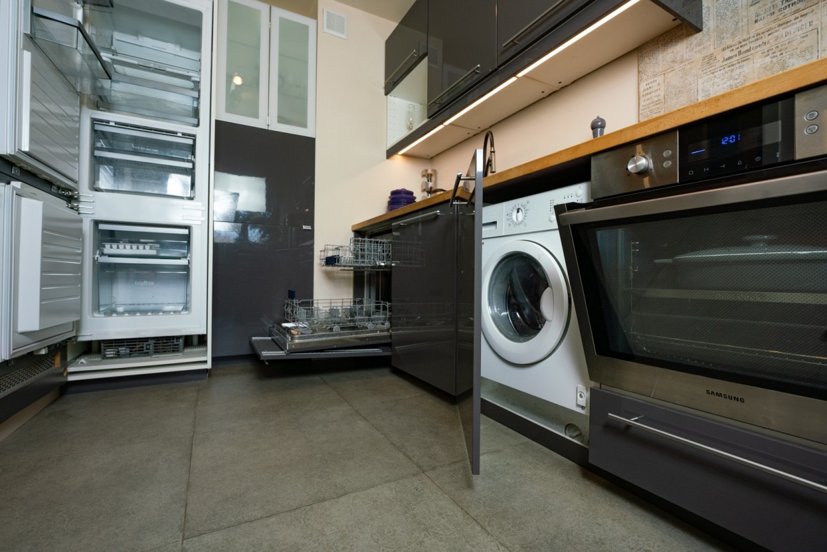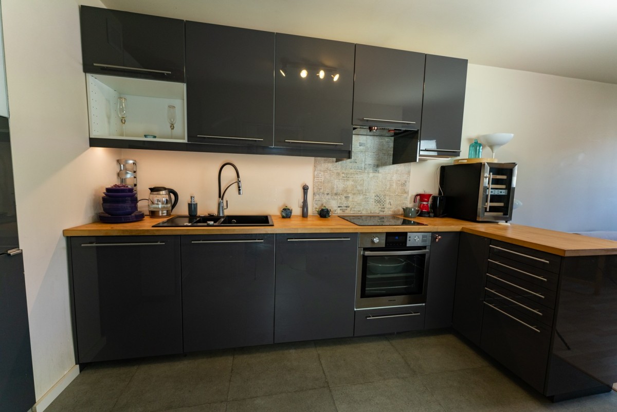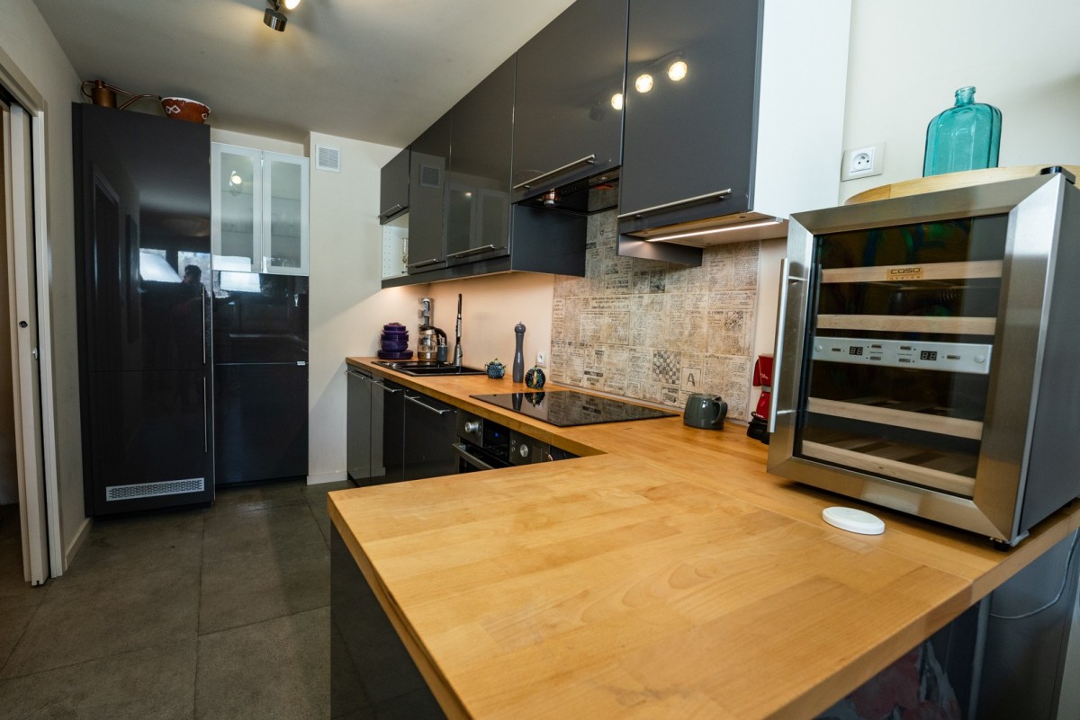 Kuchnia wykonana na wymiar i w pełni wyposażona (zmywarka, lodówka, piekarnik, płyta, okap, pralka, chłodziarka do wina). Całość utrzymana w nowoczesnym, spójnym stylu.