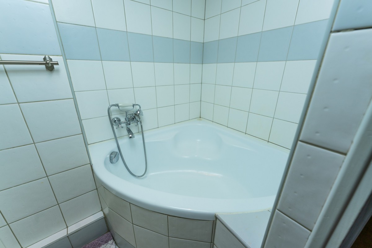 - łazienka z wanną i dwiema umywalkami