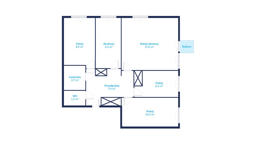 Układ i wnętrze Mieszkanie składa się z czterech niezależnych pokoi, oddzielnej kuchni, łazienki, osobnego WC oraz przestronnego korytarza.