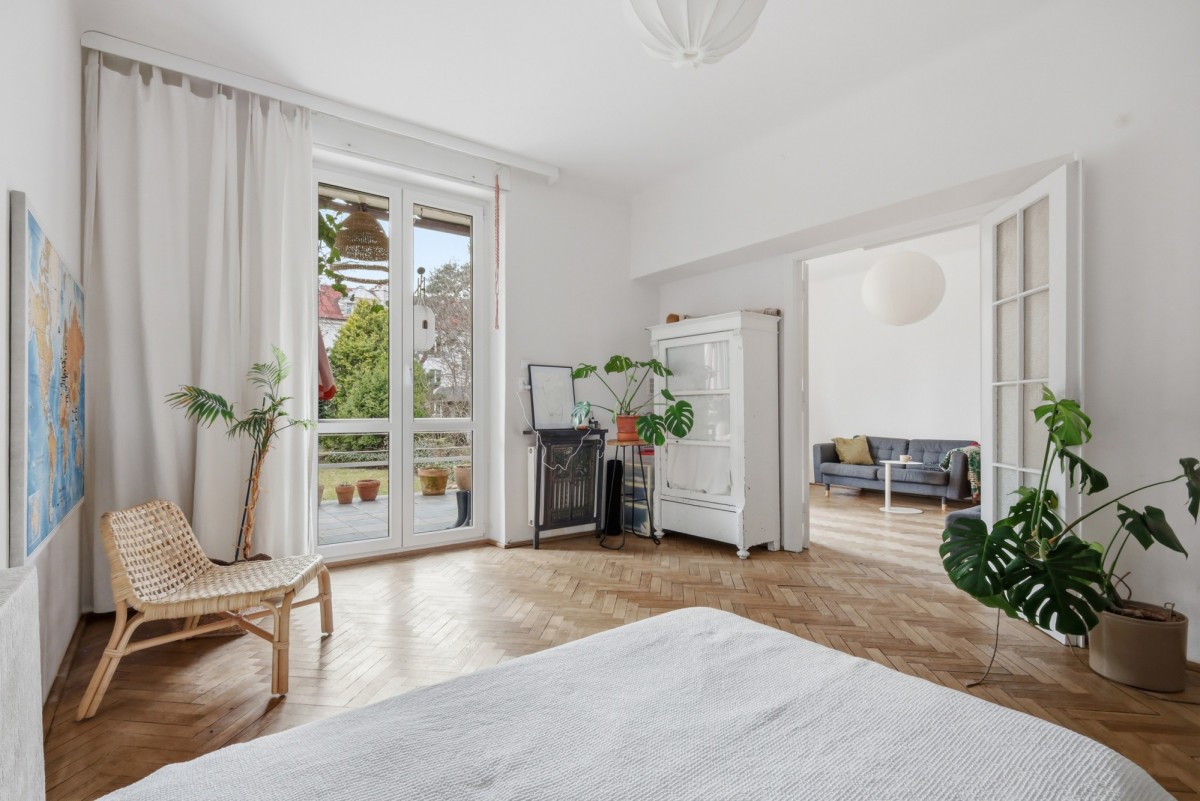 Mieszkanie jak dom, z pokoju dziennego i jadalni ( lub sypialni) jest wyjście na uroczy taras i do pięknego 200 m2 ogrodu.