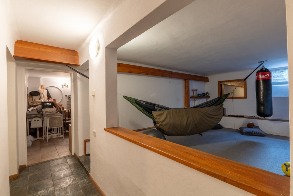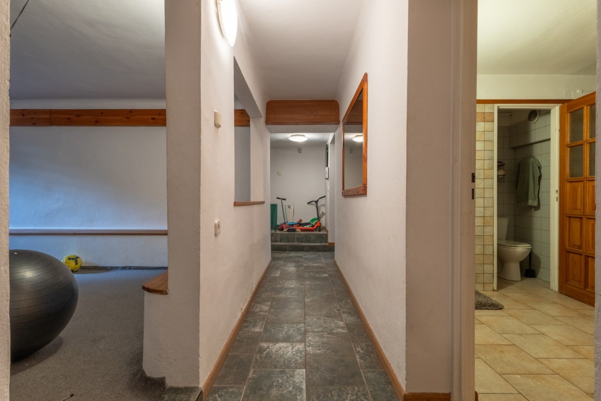 W przyziemiu jest duża przestrzeń do własnej aranżacji idealna na fitness czy salę kinową, obecnie duży pokój ćwiczeń, kilka mniejszych pomieszczeń gospodarczych w tym pralnia, jeszcze jedna łazienka etc.