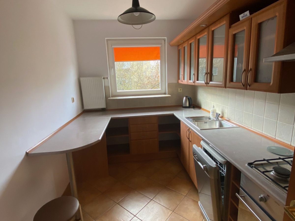 Kuchnia z oknem 8 m2, kuchenka gazowa, piekarnik elektryczny, zmywarka, lodówka.