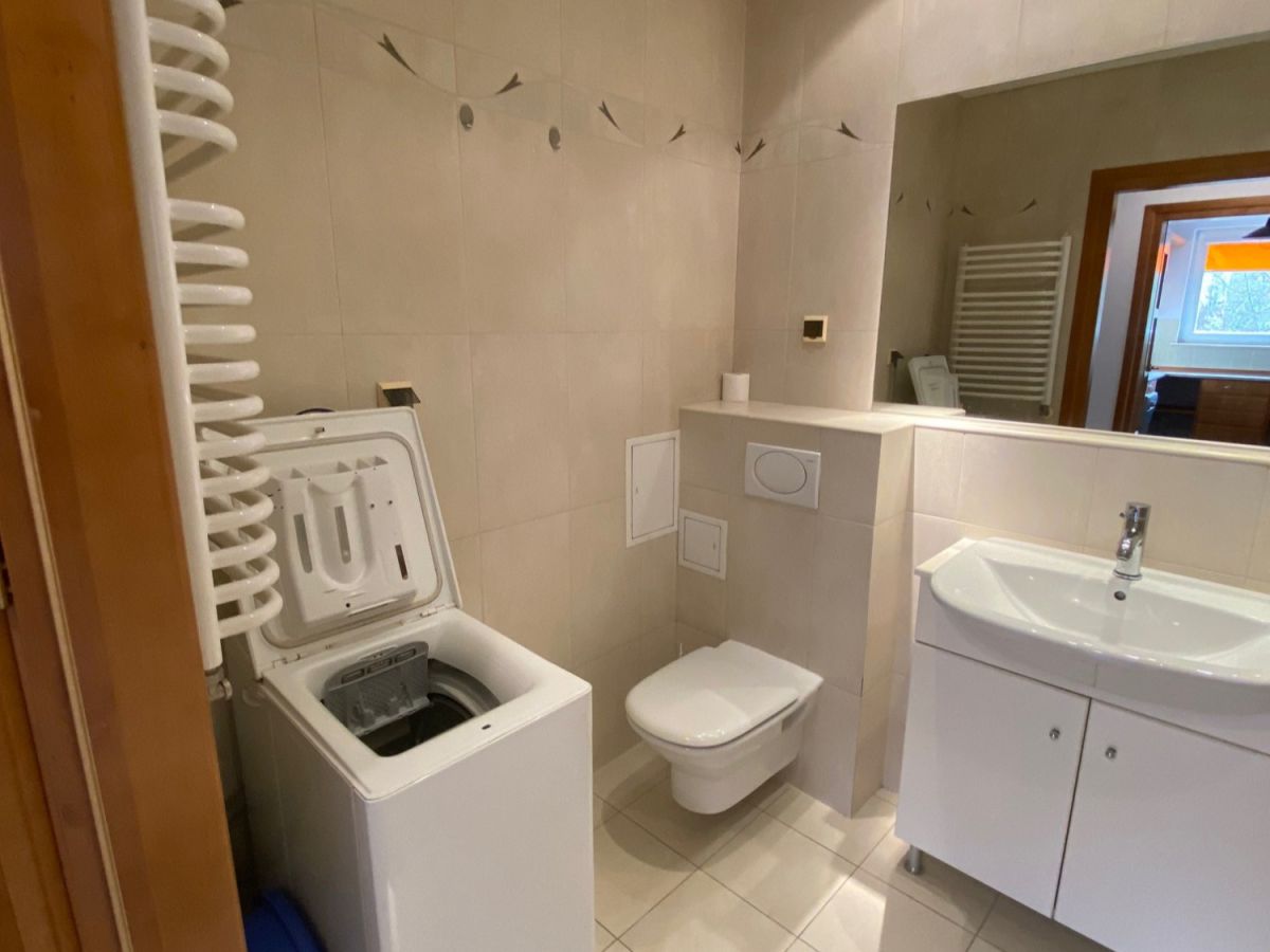 Duża łazienka z WC z lustrem, szafką pod umywalką, wanną, pralką i suszarką.