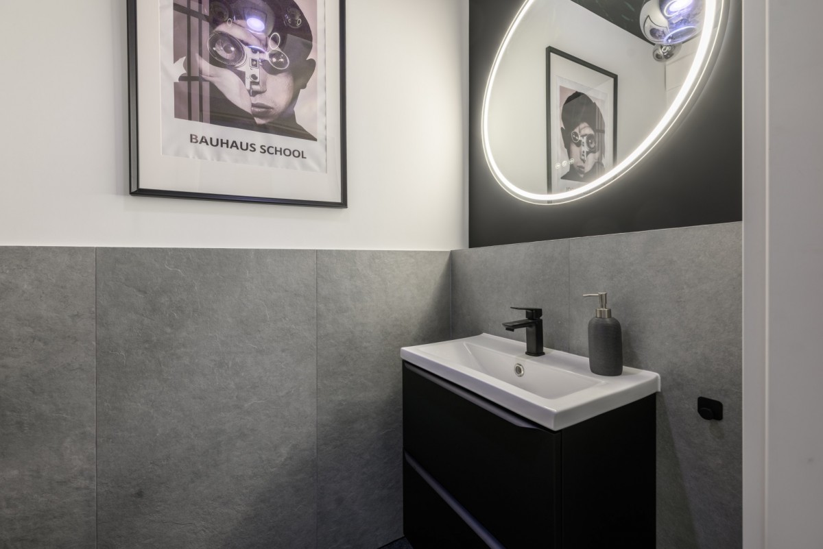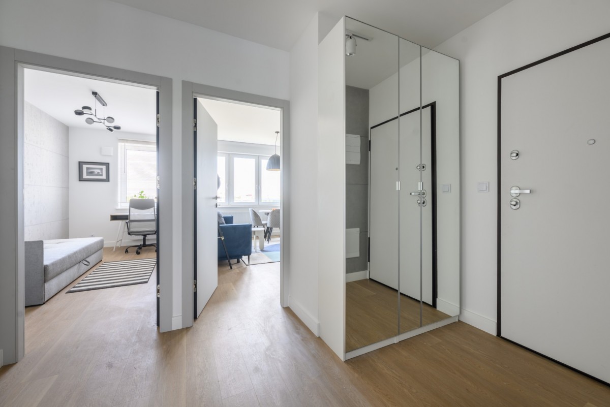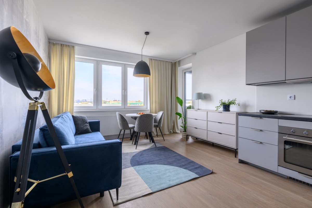 Mieszkanie znajduje się na 5 z 6 pięter, jest dwustronne, jasne i gotowe do wprowadzenia — nikt wcześniej tu nie mieszkał. Zostało urządzone w nowoczesnym, stonowanym stylu. Jasne fronty kuchenne i przyjemna kolorystyka wnętrz tworzą spójną całość. Na podłodze położono panele winylowe, które są trwałe i łatwe w utrzymaniu, a jednocześnie nadają mieszkaniu ciepłego charakteru. Wnętrze jest dobrze doświetlone o każdej porze dnia.